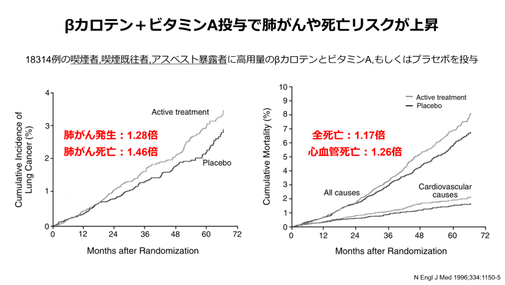 ただし、喫煙者やアスベスト暴露者に関しては高用量のβカロテンとビタミンAの摂取で肺がんや死亡リスクが上昇するという報告もありますので注意が必要です。