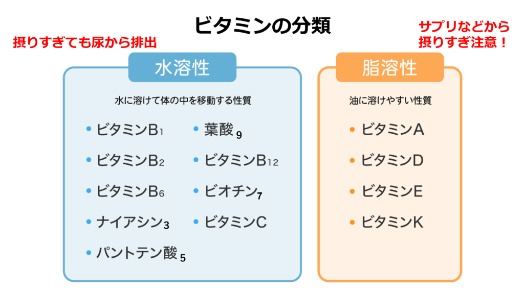 特に脂溶性ビタミン(A・D・E・K)は体に蓄積するため注意が必要です。